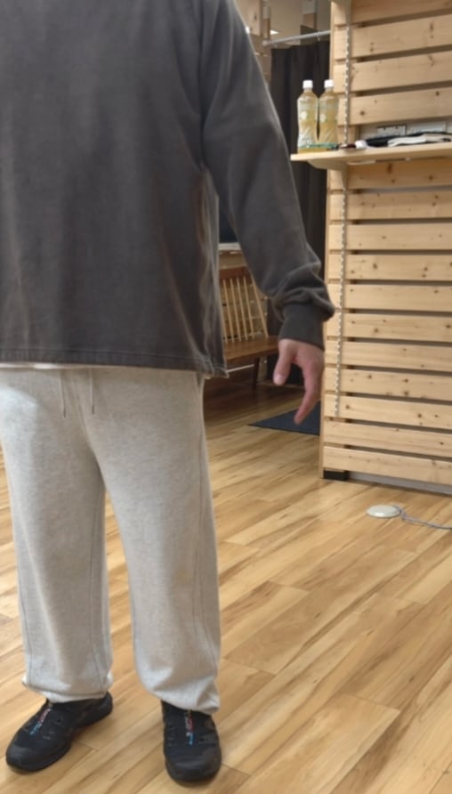 (参考程度に、最後に中肉中背の男性の着用画像も掲載しておきます。→体感的に、袖丈、着丈、身幅は問題なし。肩がややピッタリ。パンツはポケットが開く。以上から、男性なら細身~一般体方ならOKな気がしました。)