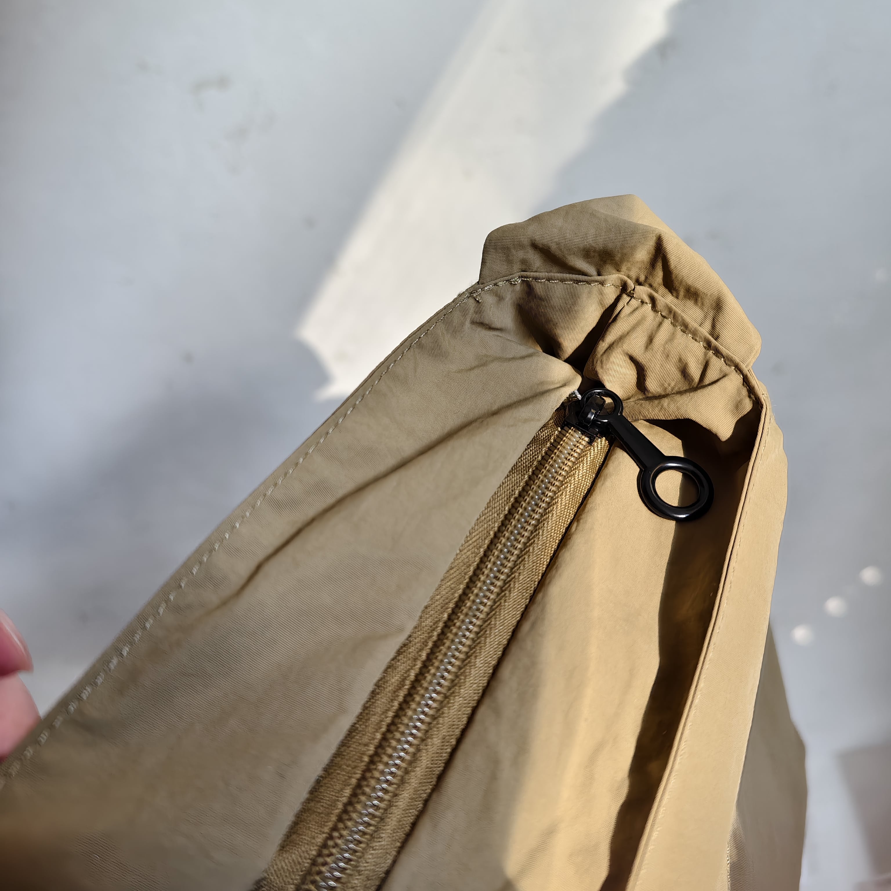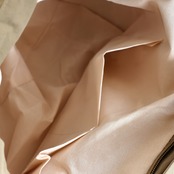 なお、内側生地と特徴的な形状の引手はボディバッグと同じものです。