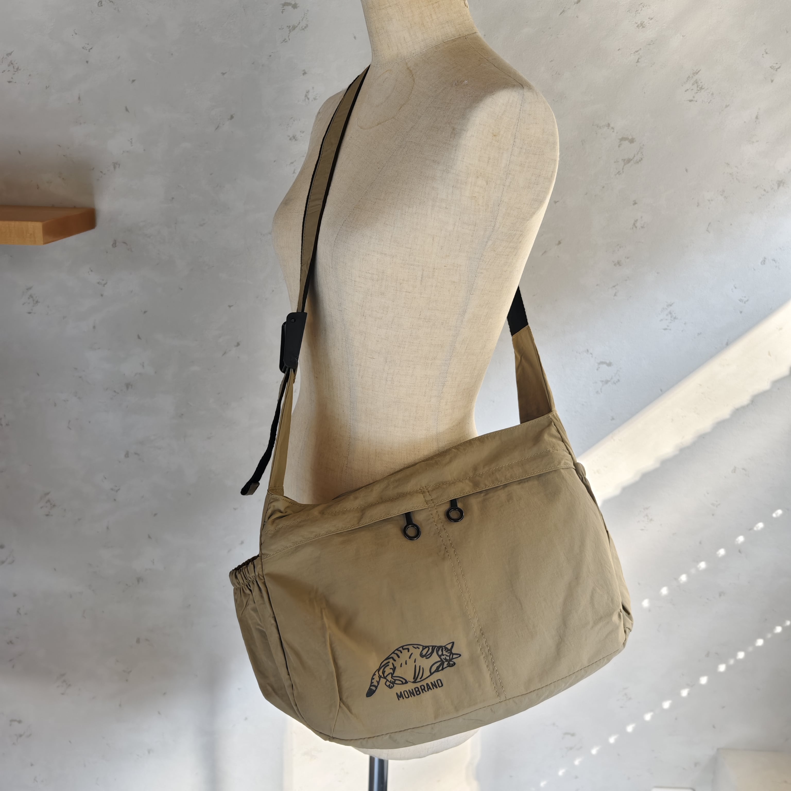 軽量ポリエステル素材で作られた「シリコンワッペンボディバッグ」。重さが苦手な方、日常荷物の多い方にぴったりです。底のカーブが特徴的なデザインで、マチが広いので必要なものをしっかり収納できます。サイドポケットはギャザー仕様で中のものが飛び出しにくい工夫がが。内側には小ぶりのオープンポケット×2と、前面にはファスナーポケット×2が付いているので小物の仕分けも◎。